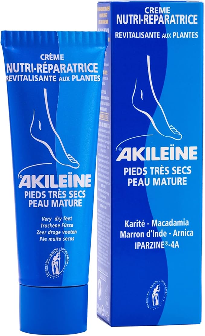 Description: La Crème Nutri-Réparatrice AKILEÏNE nourrit dès 7 jours et répare dès 14 jours les pieds secs et abîmés.